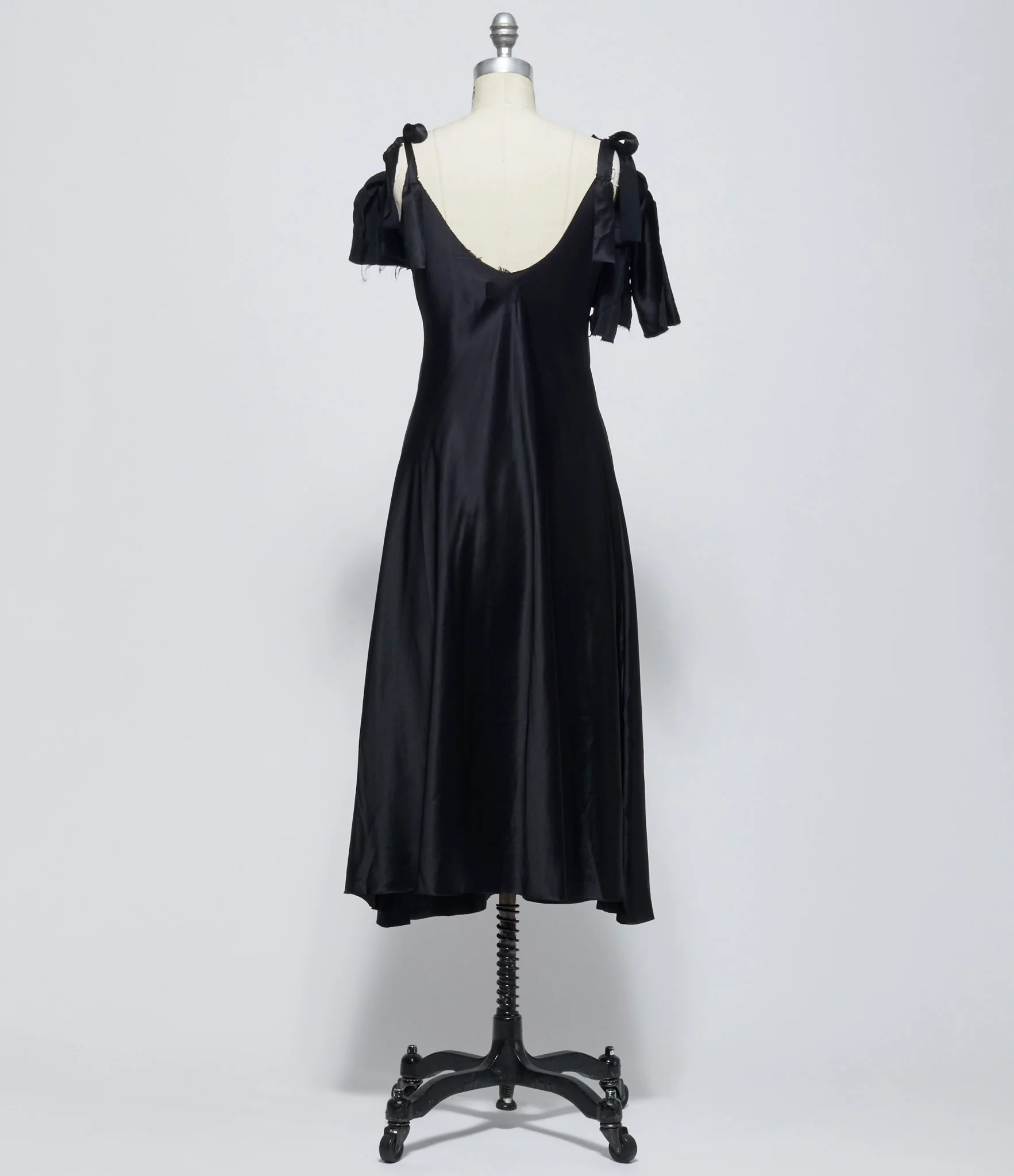 Silk satin long slip dress in black featuring braided rope across neckline into adjustable tie straps. Unfinished and raw edged seams and hems throughout. Low back. 100% silk. Dry clean only. UK sizing. Made in England. Mannequin is size 6 wearing size M.