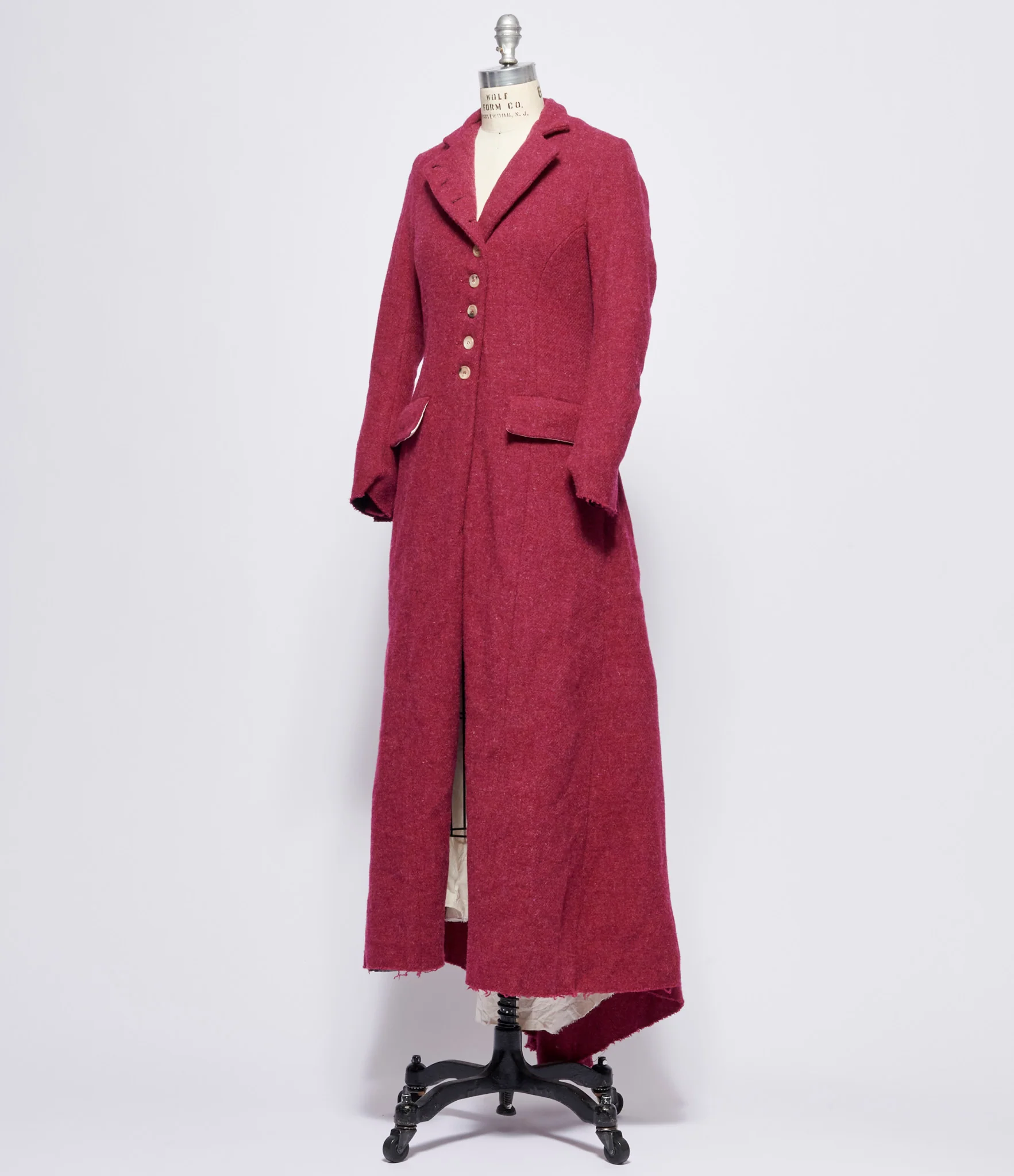 Wool tweed long sleeve full length coat in raspberry. Notched lapel stand collar. 9 button closure and two flap pockets at front. Single button surgeon's cuff. Two buttons at back for adjustable length and draping. Unfinished and raw edged at hem and sleeve hem. Fully lined in cotton. 80% wool, 20% cashmere. Lining: 100% cotton. Dry clean only. UK sizing. Made in England. Mannequin is size 6 wearing size S.