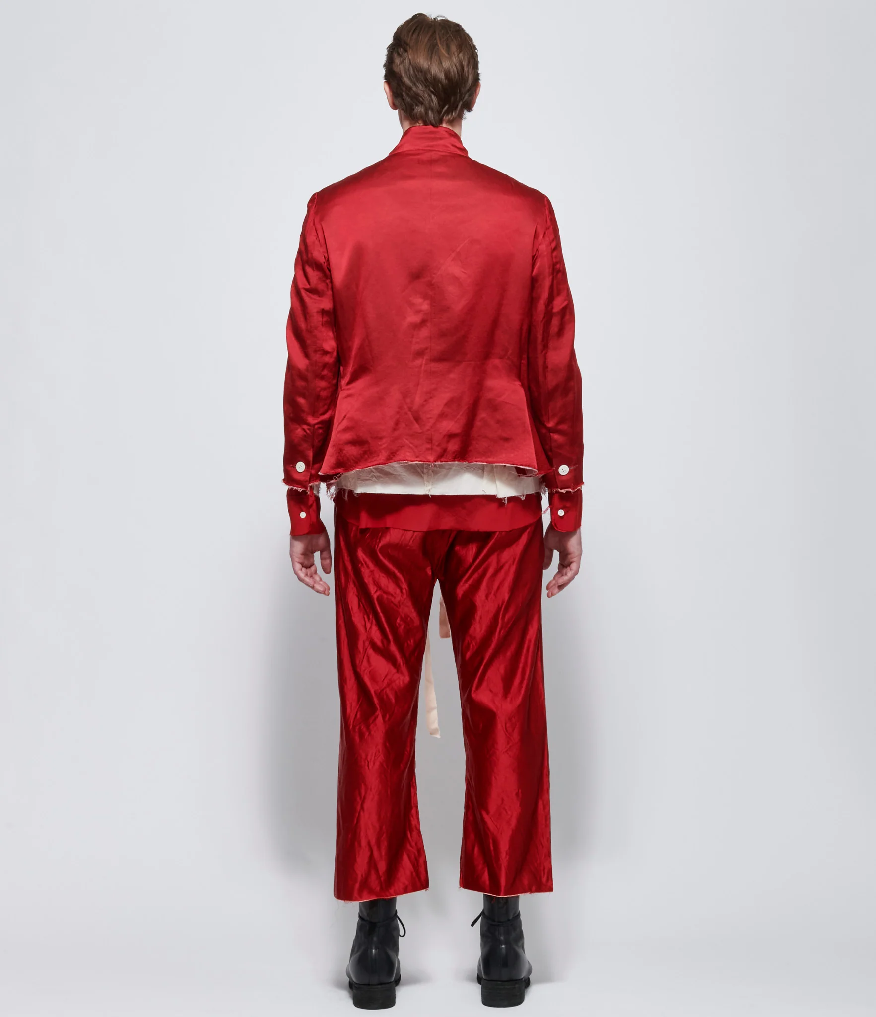 Silk satin heavy eight button blazer in scarlet. Peaked collar and eight button curved closure at front. Single welt pocket left chest side. Two welt pockets with flap waist front. Single button surgeon's cuff. Two vents at back. Raw edge, unfinished hems. Lined. Paired with red silk shirt and red drawstring side pocket pants available separately. 100% silk. Lining: 100% cotton. Dry clean only. UK sizing. Made in England. Model is wearing size M. Model is 6'2" and Chest 38 / Shoulder 19.5 / Waist 31 / Hip 37.5.