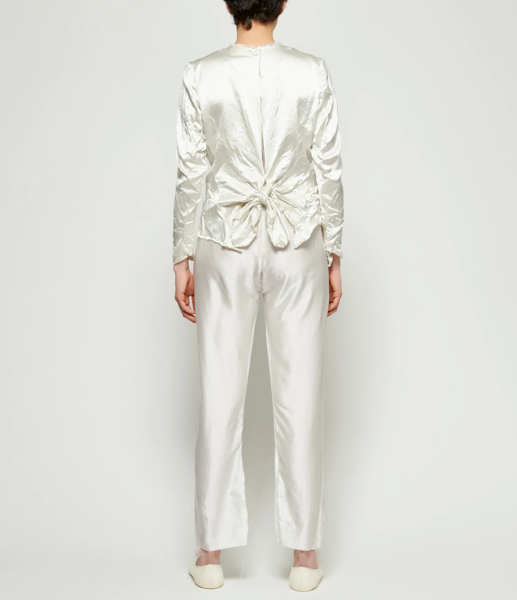 Light silk satin pajama pants in white with tonal silver vanity print. Grosgrain drawstring closure at waist. Raw seam finishing. Relaxed fit. 100% silk. Dry clean only. UK sizing. Made in England. Model is wearing size S. Model is 5'10" and Chest 32 / Waist 25 / Hip 36.