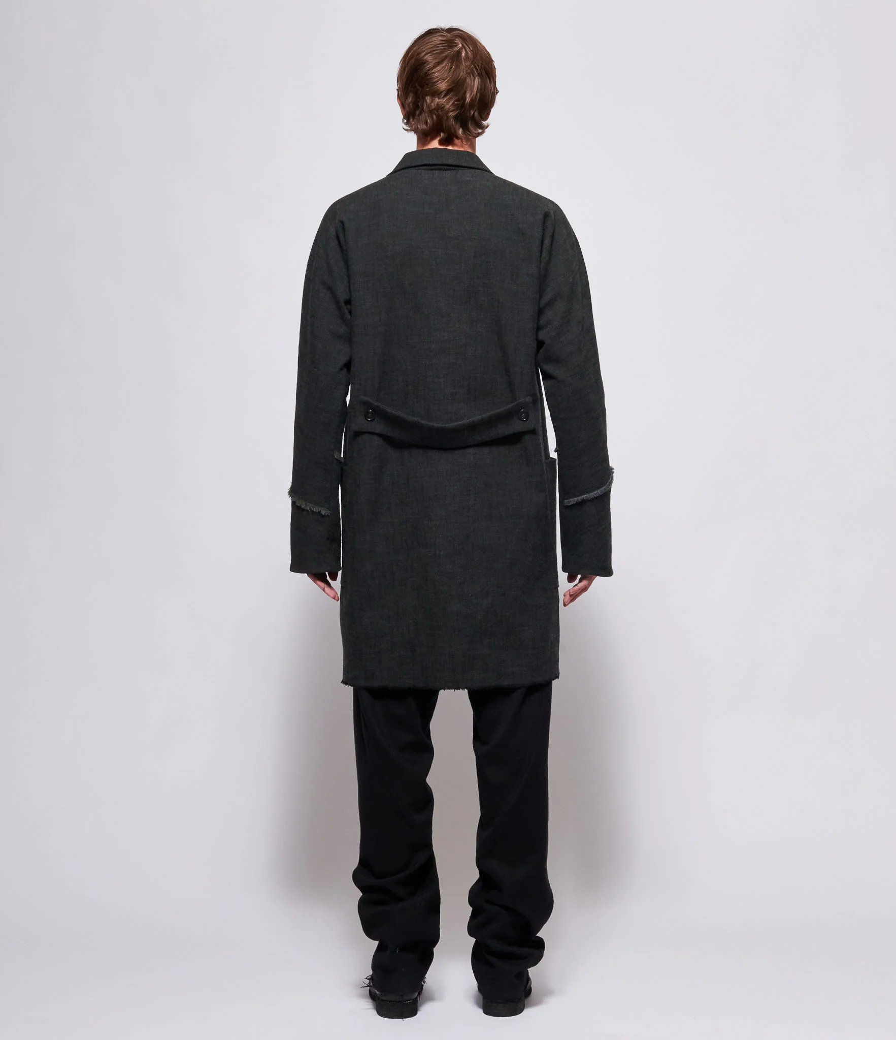 Heavy cotton blend mid length coat in dark green. Spread collar. Center front button closure. Two horizontal slit pockets at chest. Two large patch pockets waist front. Raw edge details at sleeves. Strap with two buttons at back. Raw edge hem. 79% cotton, 17% wool, 4% polyamide. Dry clean. Made in Italy. Model is wearing size 50. Model is 5'10" and Chest 32 / Waist 25 / Hip 36.