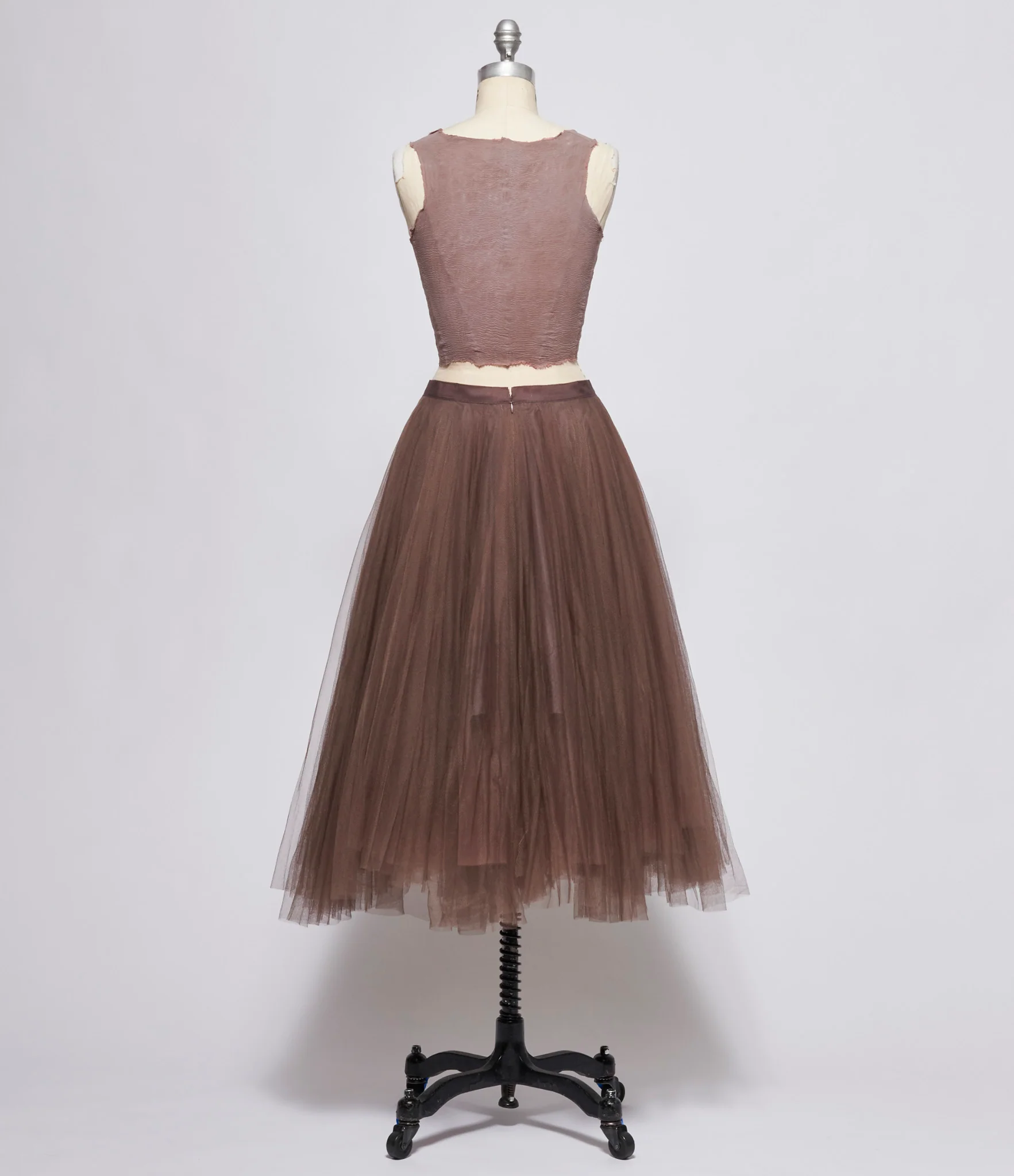 Three ply silk nylon blend and nylon tulle gathered mid length skirt in moka featuring silk skirt lining. Hidden zip hook and bar closure center back. 84% silk, 16% nylon. 100% nylon. Lining: 100% silk. Dry clean only. FR sizing. Made in France. Mannequin is wearing size 36. Mannequin size 6.
