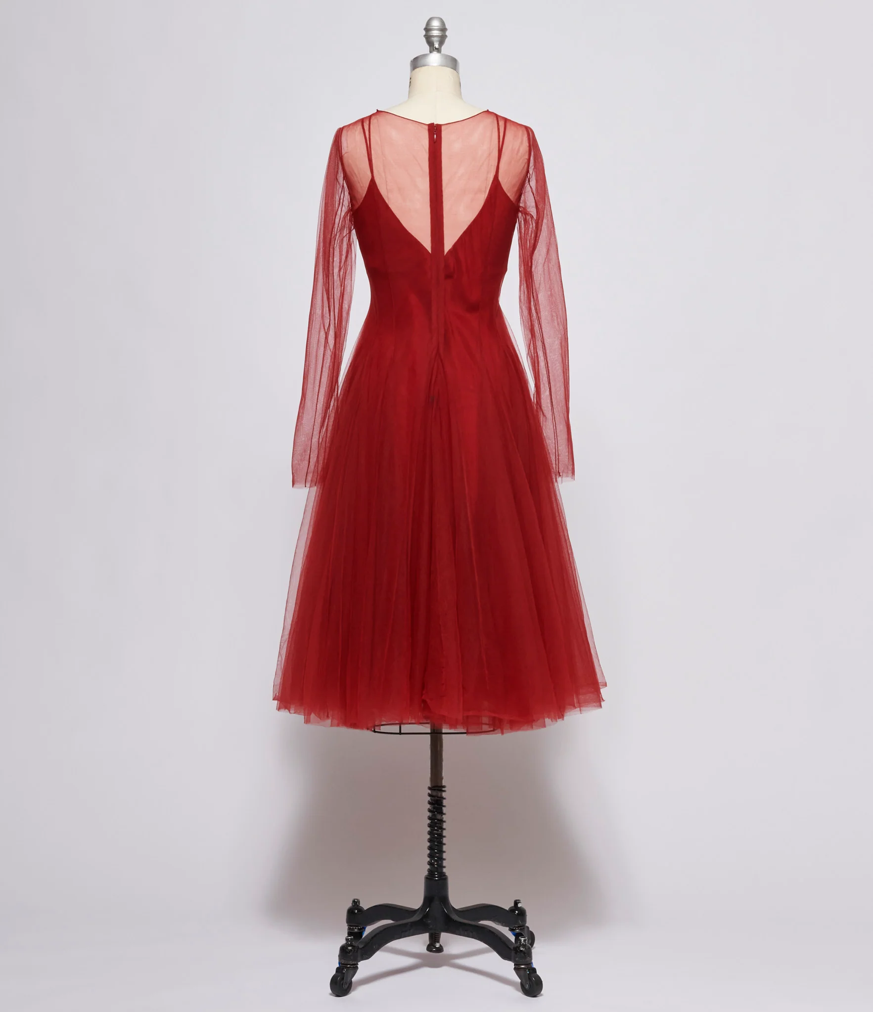 Two ply nylon tulle long sleeve dress in red. Featuring cross darting and circular construction for draping and volume. Round neck collar. Zip closure at back. Removable v-neckline silk slip liner. 100% nylon. Lining: 100% silk. Dry clean only. FR sizing. Made in France. Mannequin is wearing size 38. Mannequin size 6.