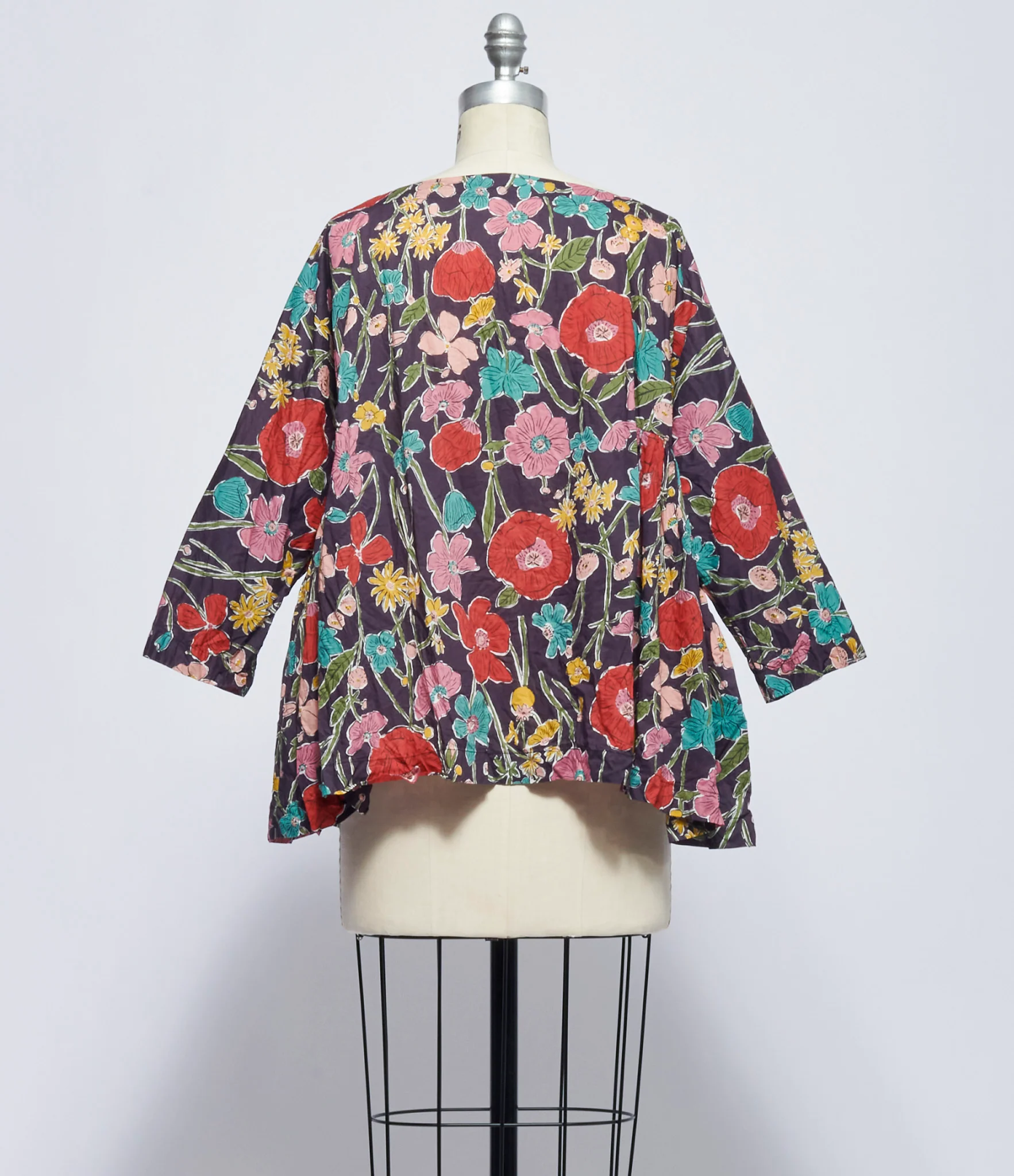Crinkled cotton three quarter sleeve shirt in violet multicolor floral print. Wide square neck neckline. Seamless shoulder. Gathering at each waist side with tie at left side and loop at right side to cinch waist. Inseam pockets at each side seam. Straight hem.100% cotton. Dry clean only. IT sizing. Made in Italy. Mannequin is wearing size OS. Mannequin is size 6.