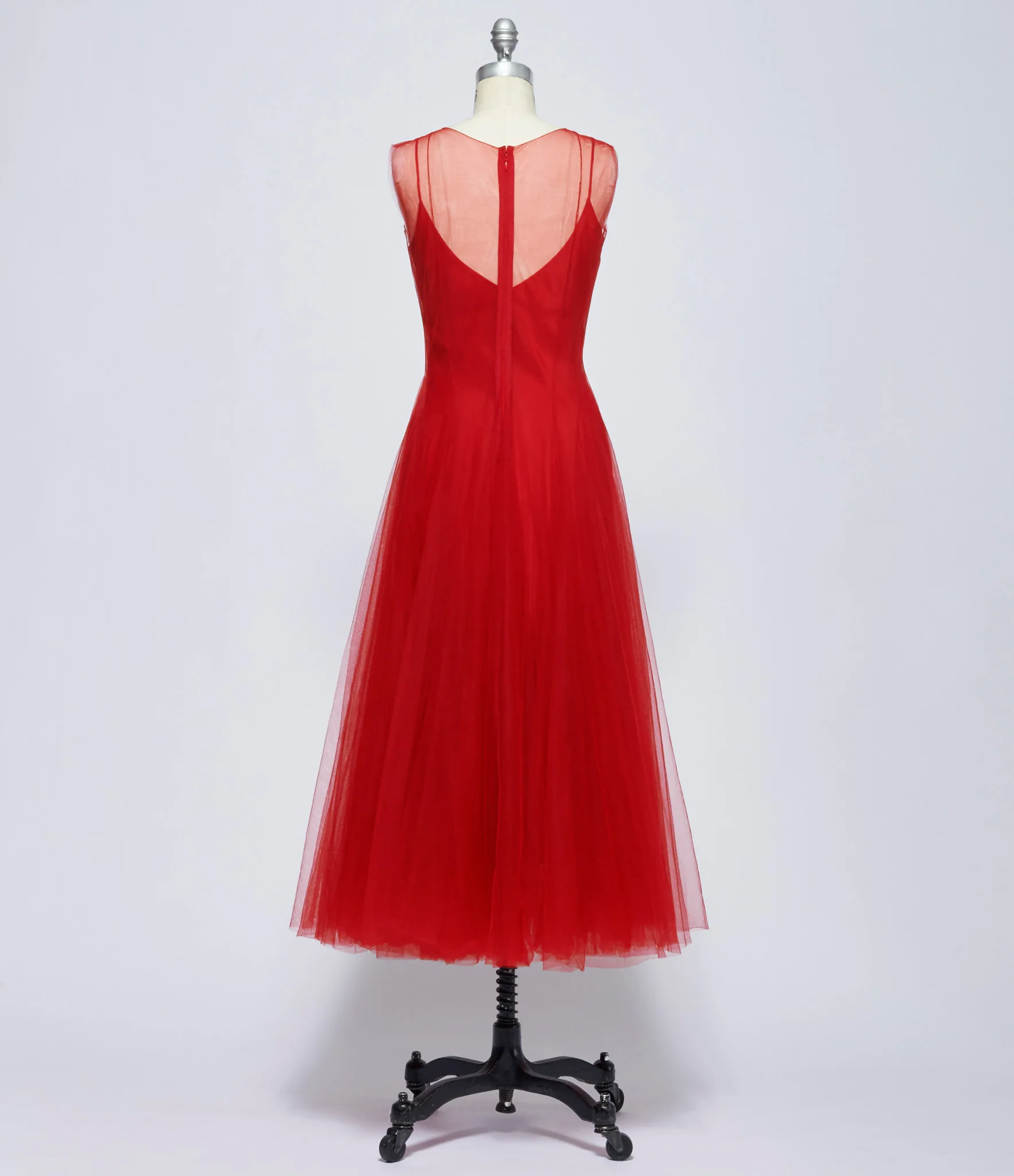 Two-ply polyamide tulle sleeveless dress in red. Featuring gathered detailed under layer skirt. Darting and circular construction for draping and volume throughout. Boat neck collar. Zip closure at back. Removable silk slip liner. Body: 100% polyamide. Lining: 100% silk. Dry clean only. FR sizing. Made in France. Mannequin is wearing size 38. Mannequin size 6.