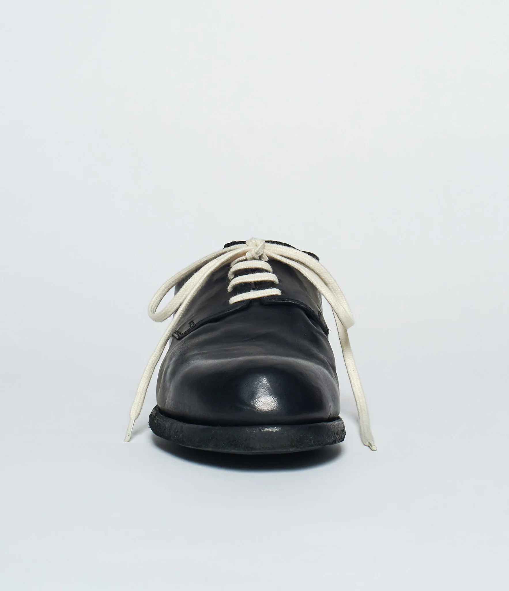 Soft horse full grain leather derbies in black. Contrast white laces. Lined. Full leather outsole with 30mm heel. Goodyear construction.?ÿComes with extra laces?ÿand additional rubber soles that can be attached by a cobbler. 100% horse. IT sizing. Made in Italy.