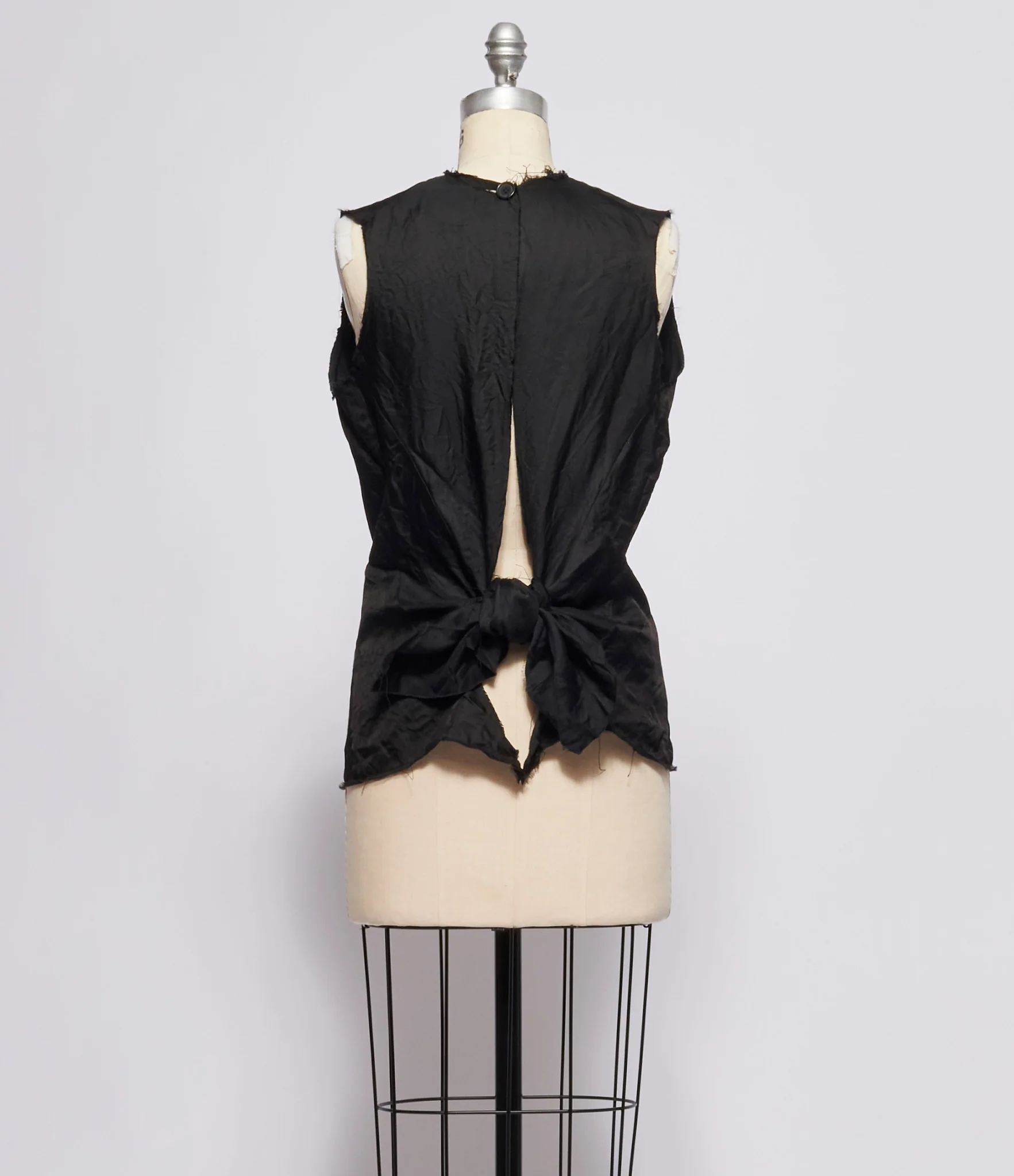 Silk sleeveless knot top in black. Knotted detail at back and raw edge detailing throughout. Crewneck collar. Keyhole closure at back. Slits at cuffs. Slight handkerchief hem. Cropped. 100% silk. Dry clean only. UK sizing. Made in England. Mannequin is size 6 wearing size S.