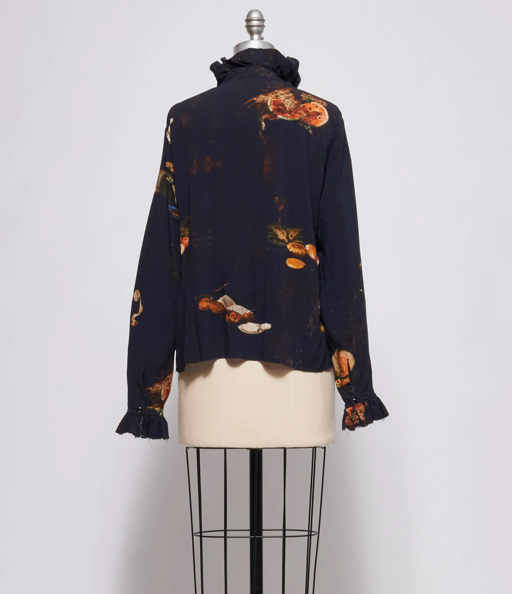 Viscose button down blouse in dark blue featuring brown toned table scape print. Ruffled collar. Center front button closure with loose thread detailing at each button. Ruffled cuffs with single button closure. Raw edged hems. 100% viscose. Hand wash in cold. IT sizing. Handmade in Italy. Mannequin is wearing size S. Mannequin is size 6.