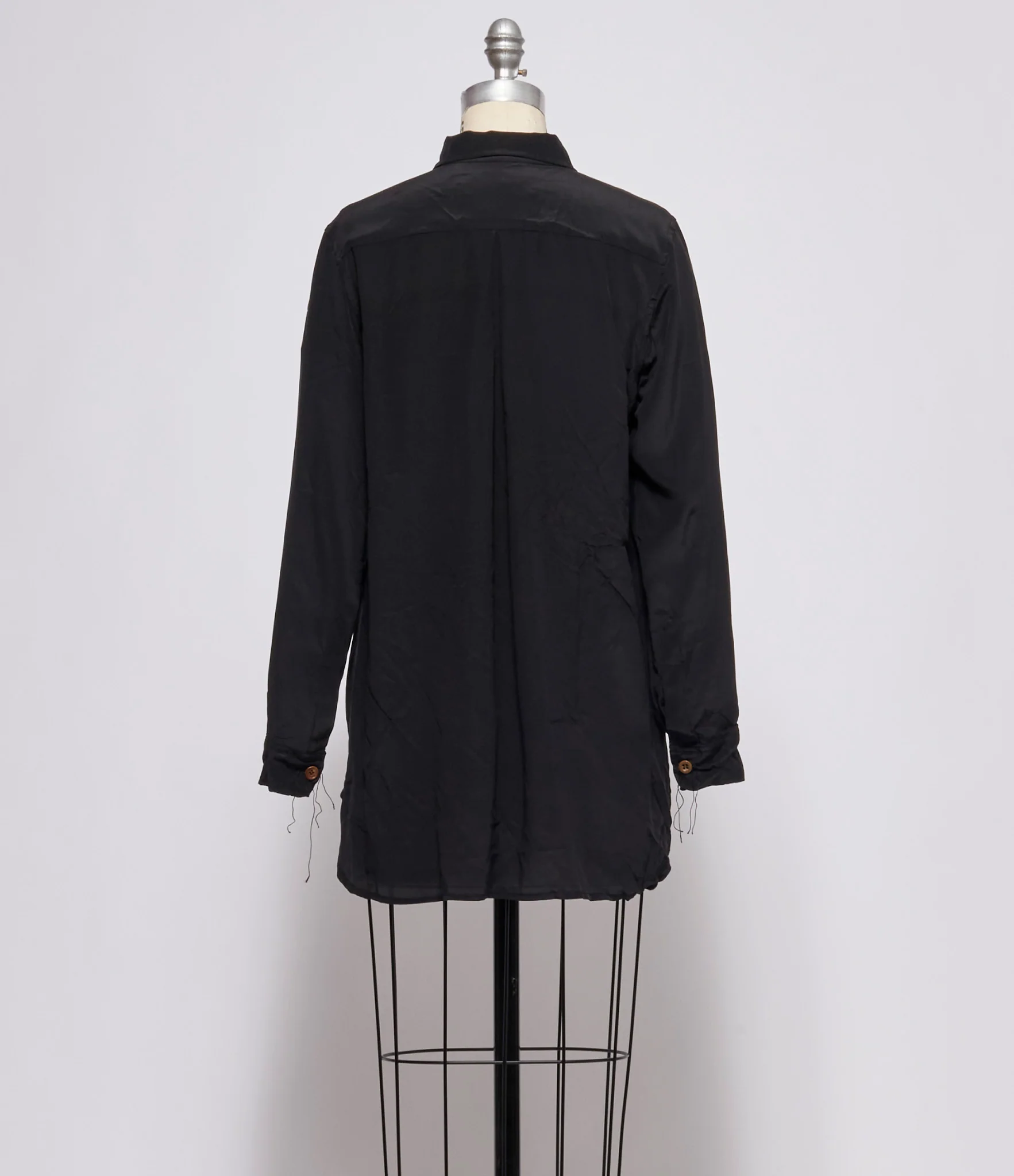 Vintage silk button down shirt in black. Straight collar. Center front button closure featuring hanging threads at each button. Single button barrel cuffs. Shirttail hem. Single pleat at center back. Hand wash in cold. IT sizing. Handmade in Italy. Mannequin is wearing size M. Mannequin is size 6.