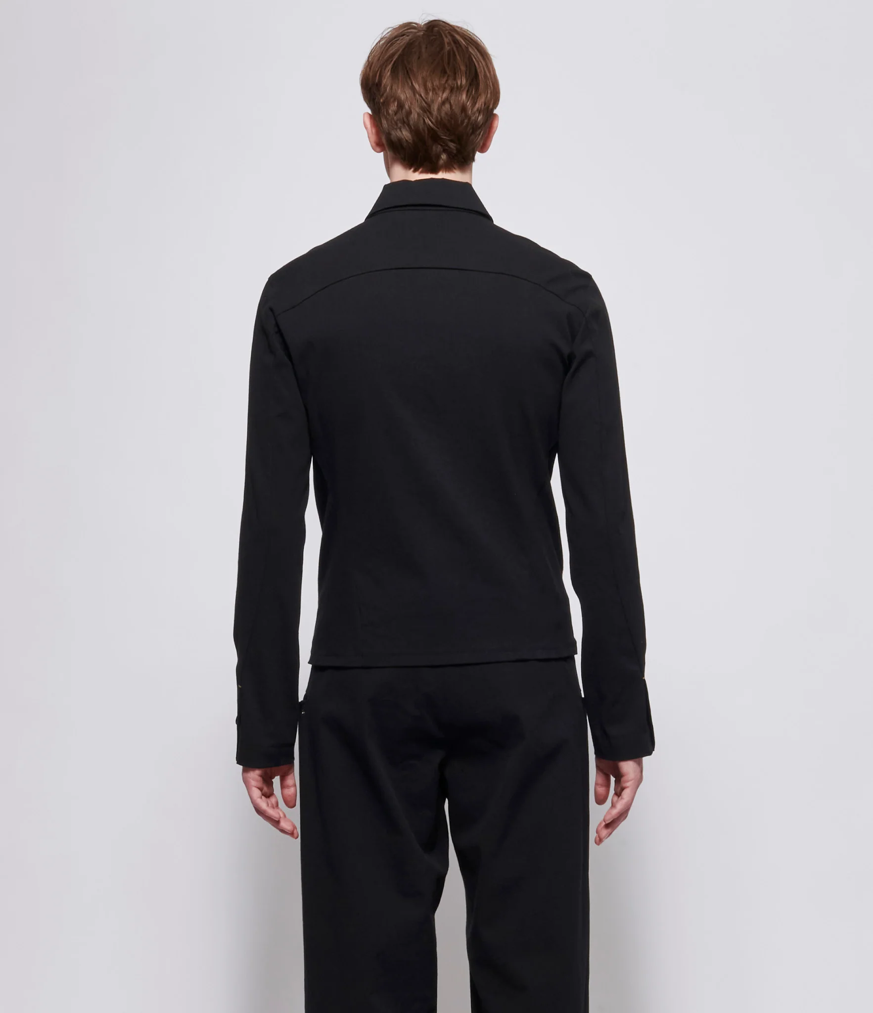 Cotton blend twill jacket in black. Spread collar. Center front button closure. Two inseam pockets chest front at yoke. Two slit pockets waist front. Curved, single button surgeon's cuffs. Straight hem. 71% cotton, 27% cupro, 2% elastane. Dry clean. Made in Italy. Model is wearing size 48. Model is 5'10" and Chest 32 / Waist 25 / Hip 36.