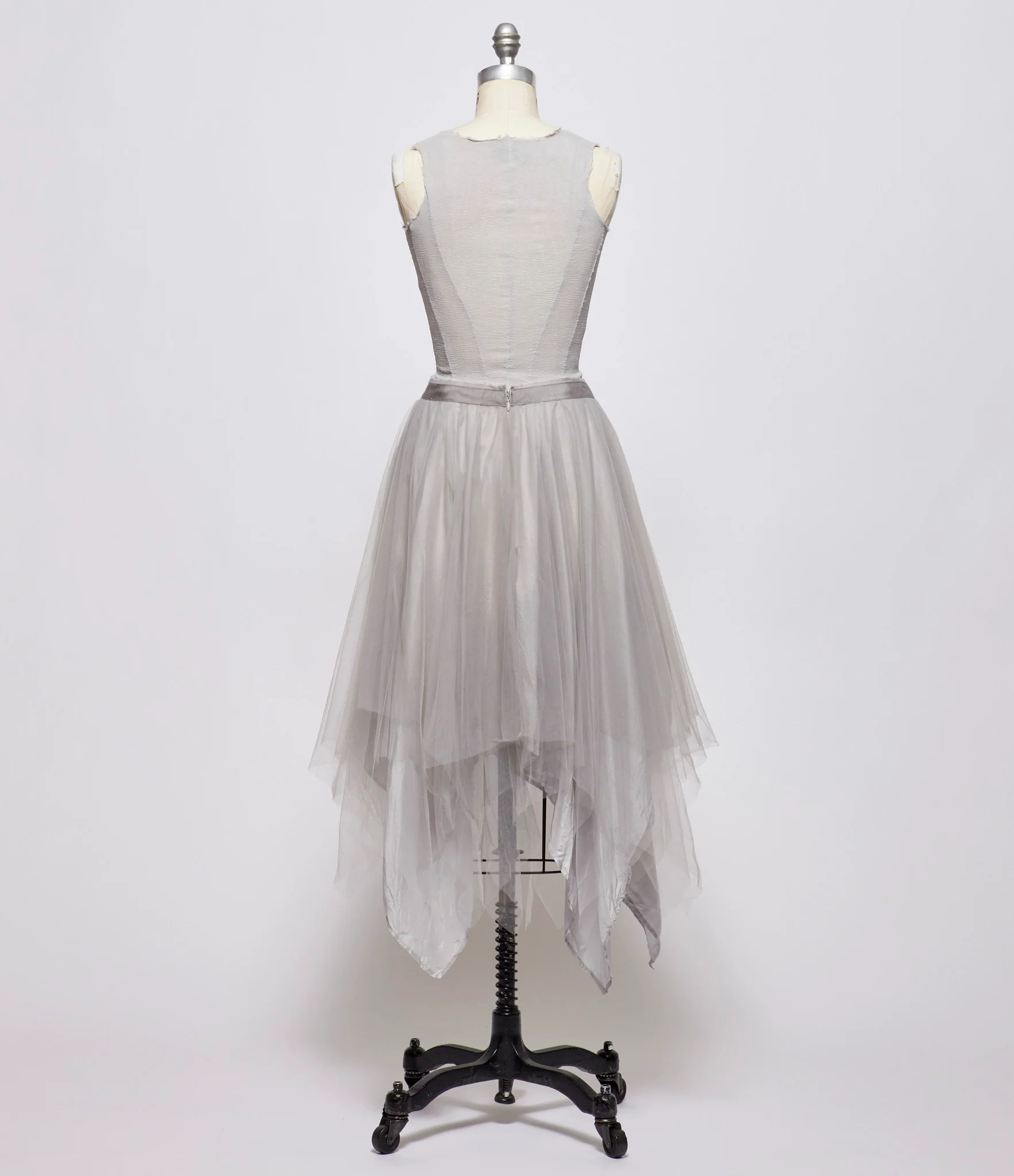 Three layered nylon tulle skirt in pearl gray. Ribbon at waistline. Center back hidden zip and hook and bar closure. Handkerchief hem. Silk lining. 100% nylon. 100% silk. Dry clean only. FR sizing. Made in France. Mannequin is wearing size 34. Mannequin is size 6.