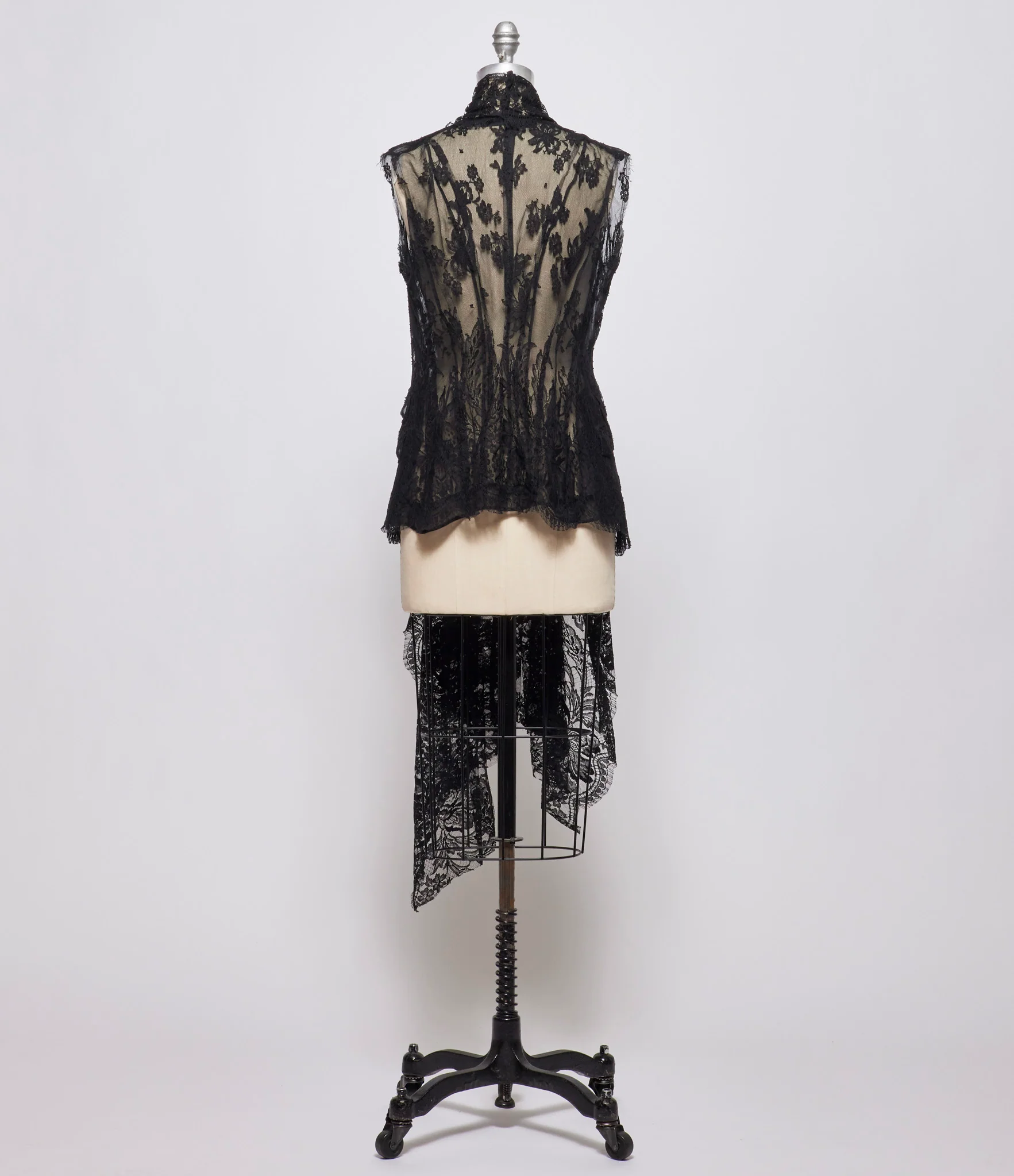 Cotton polyamide blend lace jacquard vest in black featuring open front cascading down with tie closure at waist. Four nonfunctional welt pockets with flaps at waist front. Corset like seam lines. Raw edged armholes. Scalloped edges at lace hem. Silk lined.75% cotton, 25% polyamide. 100% silk. Dry clean only. FR sizing. Made in France. Model is wearing size 36 in all variants. Mannequin is wearing size 38. Mannequin is size 6.