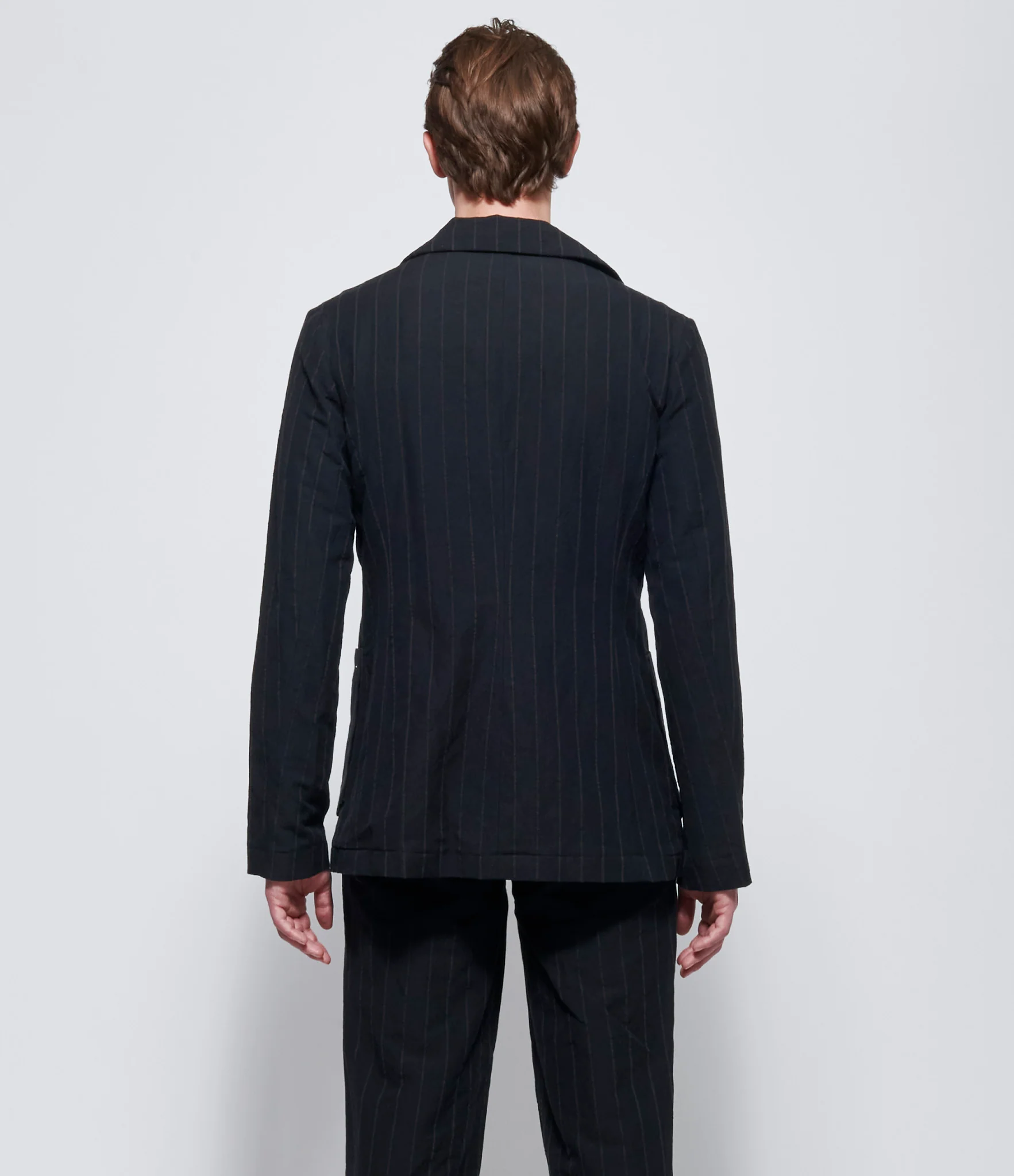 Linen cotton blend pinstripe jacket in black. Notched lapel collar. Center front button closure. Single patch pocket with additional slit pocket at left chest side. Two patch pockets waist front. Straight hem. Lined. 53% linen, 47% cotton. Dry clean. Made in Italy. Model is wearing size 50. Model is 5'10" and Chest 32 / Waist 25 / Hip 36.