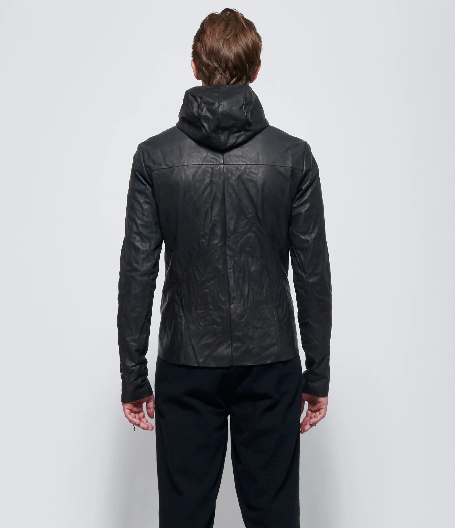 Cow leather biker jacket in black featuring detachable zip hood. Spread collar. Center front zip closure with stitch details along side. Two slit pockets at seam across chest. Two slit pockets waist front. Diagonal zip closures at cuffs. Raw edge hems. Lined. 100% cow leather. Dry clean. Made in Italy. Model is wearing size 52. Model is 5'10" and Chest 32 / Waist 25 / Hip 36.