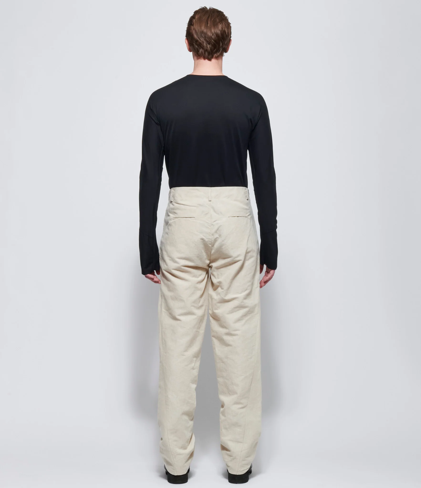 Linen, cotton, bamboo blend pants in natural. Button fly two button closure at front. Two slit pockets at front. Two slit pockets at back. Belt loops at waist. 53% linen, 33% cotton, 14% bamboo. Dry clean. Made in Italy. Model is wearing size 50. Model is 5'10" and Chest 32 / Waist 25 / Hip 36.