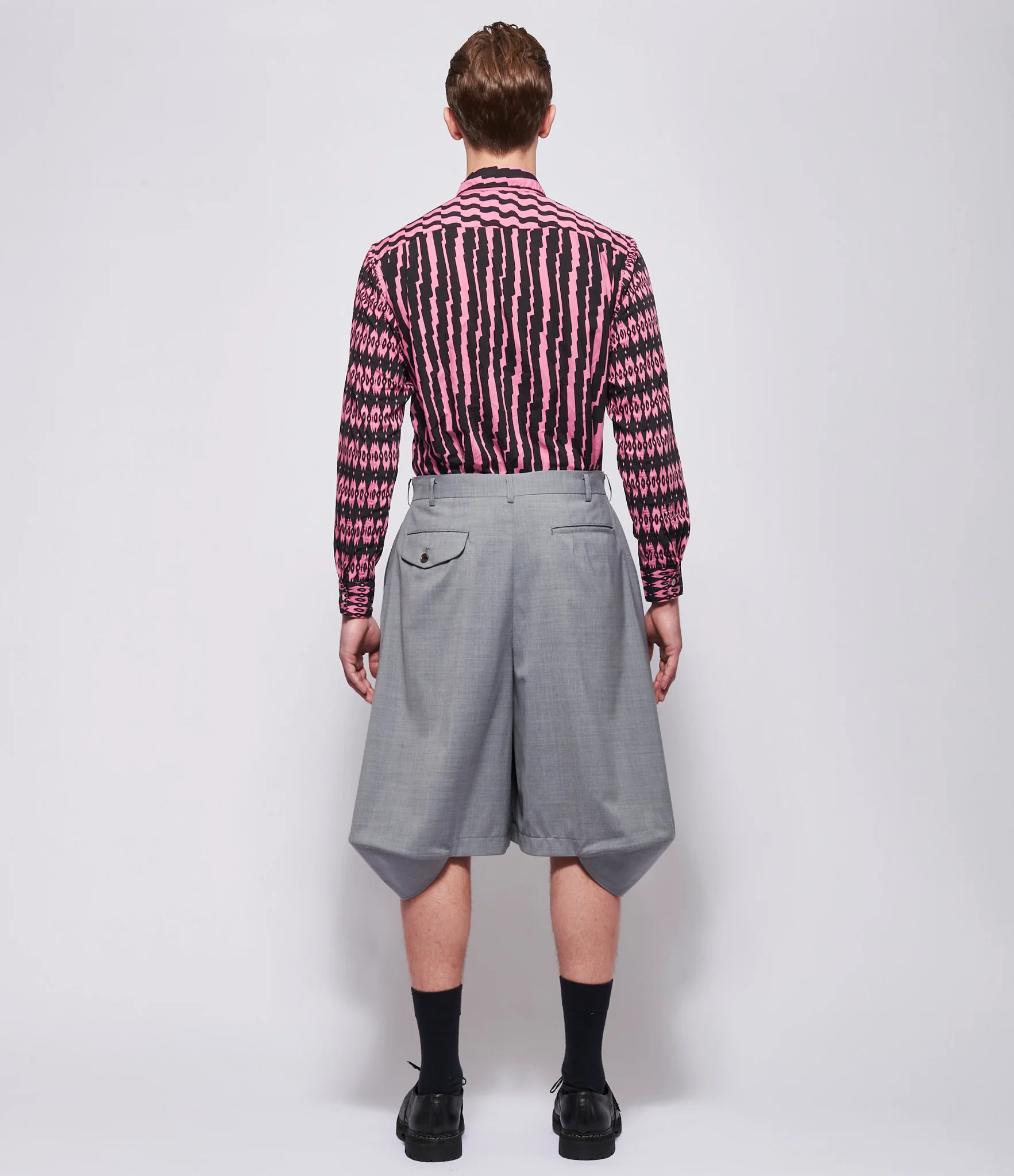 Wool blend shorts in light gray. High rise voluminous silhouette with knee length hem and sculptural draped side panels forming pointed hem extensions. Structured waistband with belt loops and single button closure. Zip fly front closure. Deep pleats at front waist creating expanded volume through leg. Side seam pockets at hips. Single rear welt pocket with flap and button closure at left back. Paneled construction shaping draped side volumes. 50% wool, 50% polyester. Dry clean only. JP sizing. Made in Japan. Model is wearing size M. Model is 6'2" and Chest 38 / Shoulder 19.5 / Waist 31 / Hip 37.5.