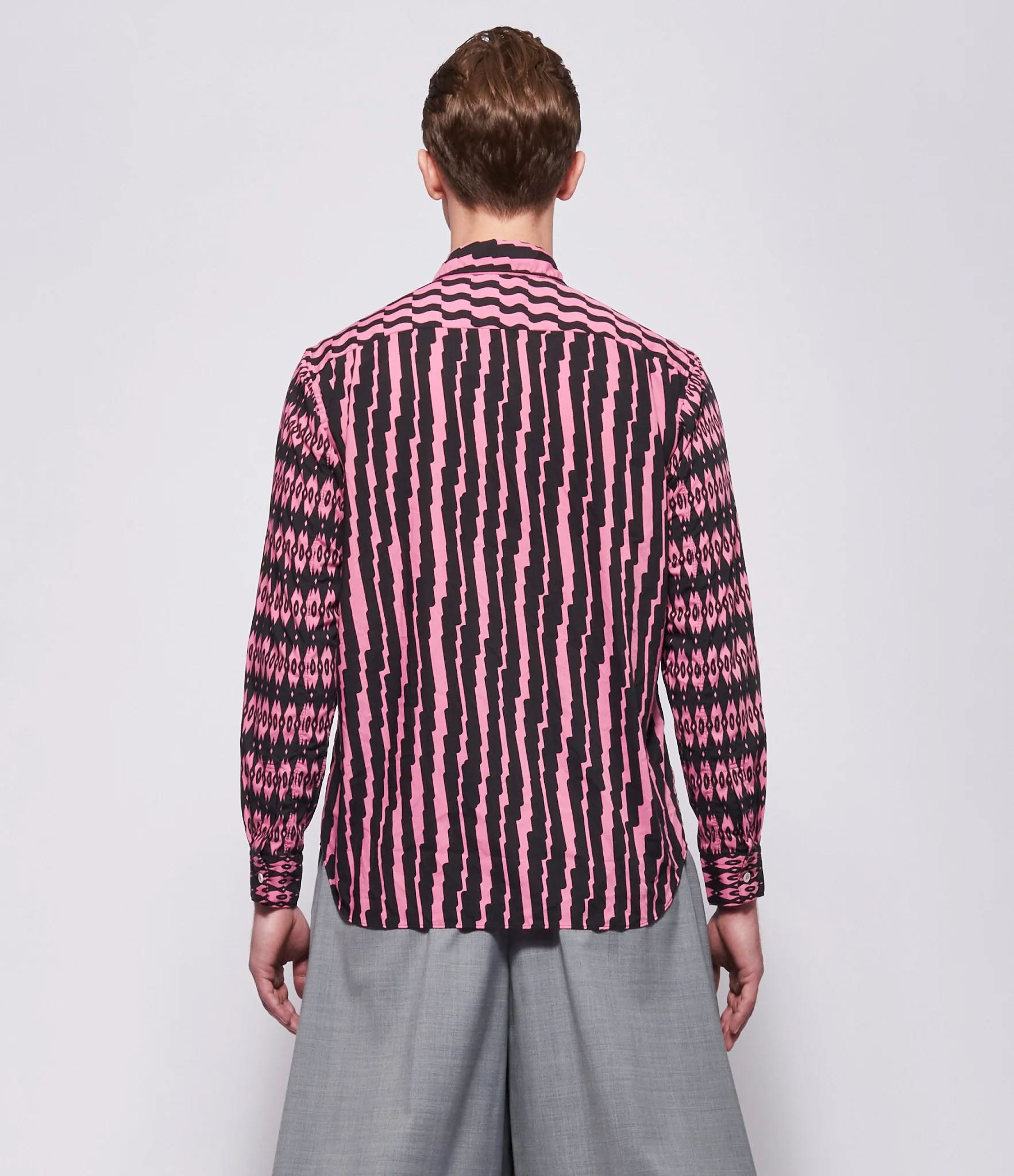 Polyester shirt featuring all-over pink and black graphic pattern. Slim straight silhouette with curved hem. Point collar. Full button front closure with light buttons. Long sleeves with button cuffs. Mixed pattern construction with vertical wavy stripe motif at front and back body and geometric pattern at sleeves. Single patch chest pocket at left chest. Back yoke. 100% polyester. Dry clean only. JP sizing. Made in Japan. Model is wearing size M. Model is 6'2" and Chest 38 / Shoulder 19.5 / Waist 31 / Hip 37.5.