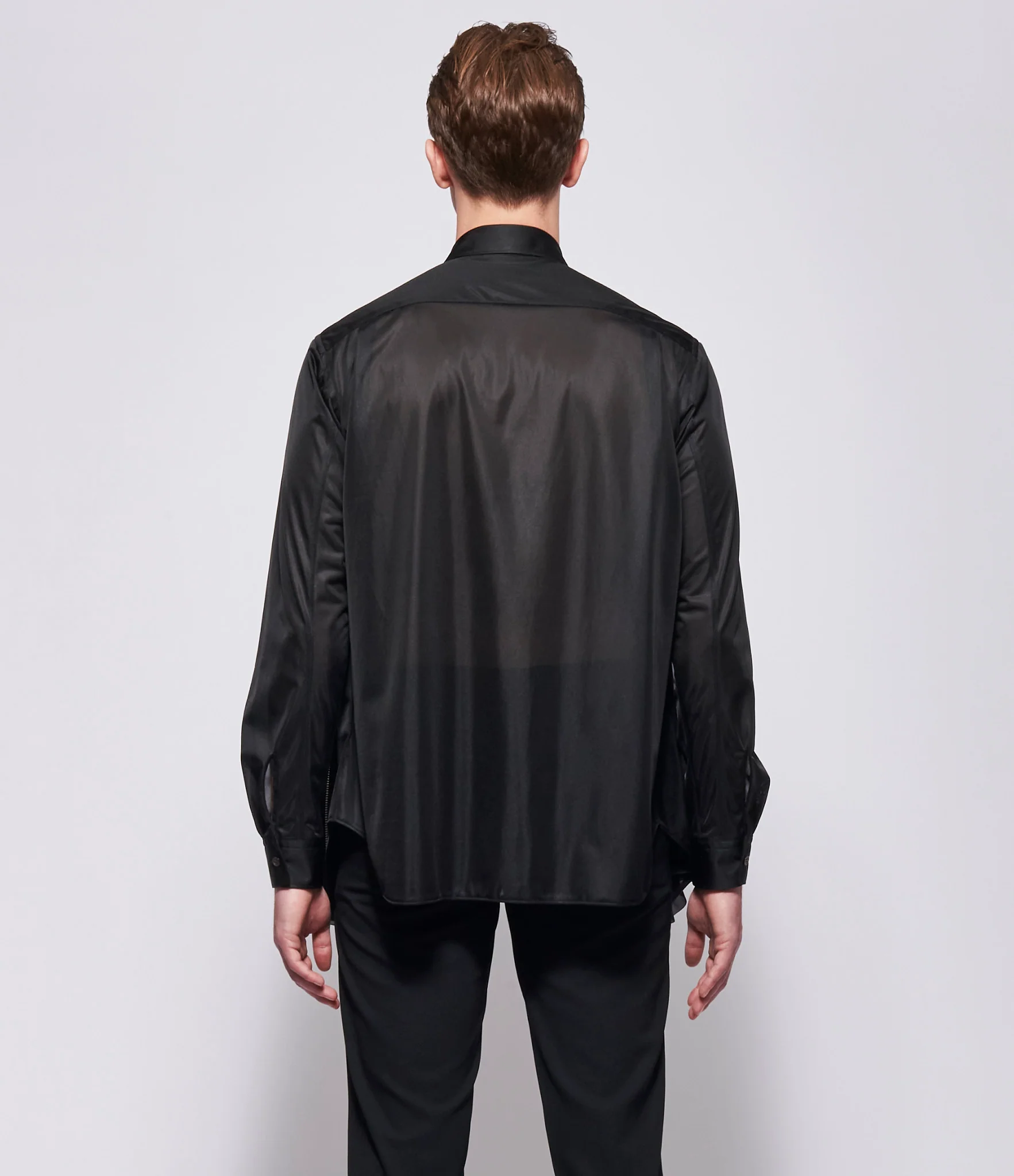 Polyester shirt in black featuring two vertical gathered ruffle panels running from upper chest to hem at front, with exposed metal zipper detailing positioned at upper chest above ruffle panels allowing for flexible styling options. Relaxed straight silhouette. Slightly extended length. Curved hem. Point collar. Full button front closure with contrasting buttons. Long sleeves with button cuffs. Plain back panel with no yoke. 100% polyester. Dry clean only. JP sizing. Made in Japan. Model is wearing size M. Model is 6'2" and Chest 38 / Shoulder 19.5 / Waist 31 / Hip 37.5.