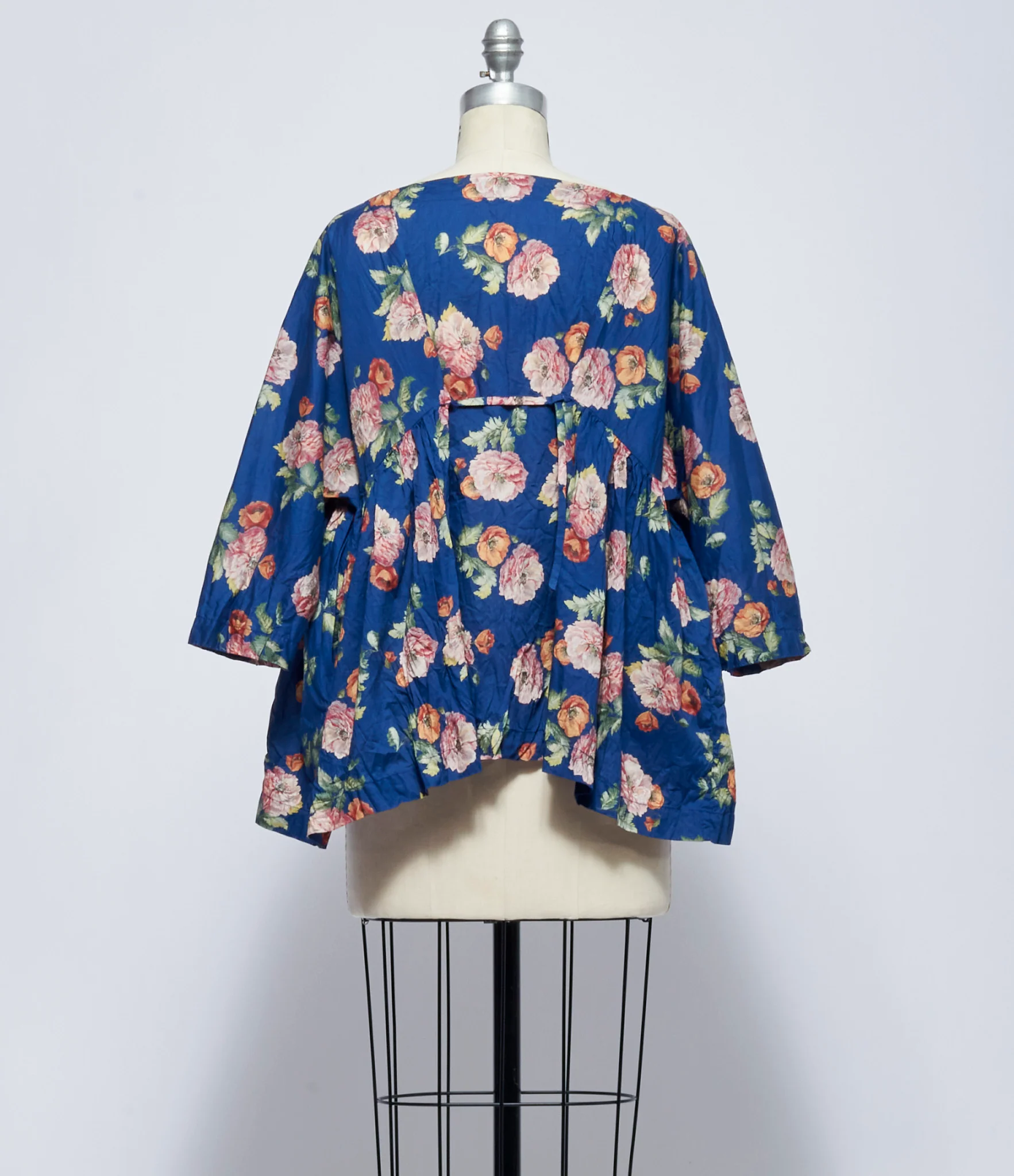 Crinkled cotton three-quarter length sleeve shirt in multicolor blue liberty floral print. Wide square neck neckline. Seamless shoulder. Gathering at each waist side with tie at left side and loop at right side to cinch waist. Inseam pockets at each side seam. Straight hem. Can be worn front to back. 100% cotton. Dry clean only. IT sizing. Made in Italy. Mannequin is wearing size OS. Mannequin is size 6.