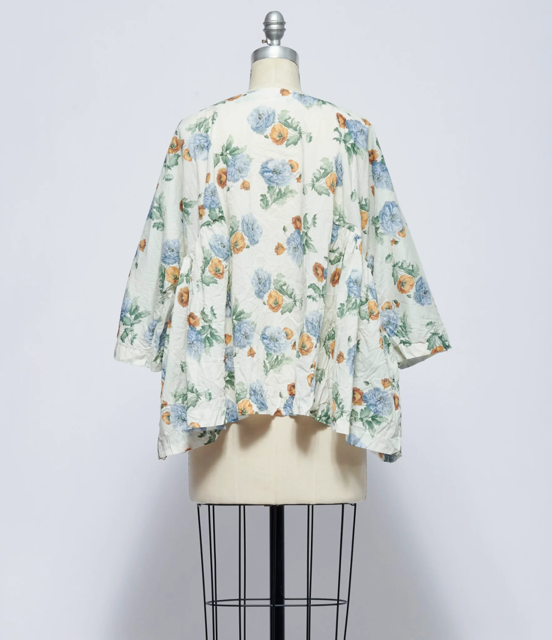 Crinkled cotton three-quarter length sleeve shirt in multicolor white floral liberty print. Wide square neck neckline. Seamless shoulder. Gathering at each waist side with tie at left side and loop at right side to cinch waist. Inseam pockets at each side seam. Straight hem. Can be worn front to back. 100% cotton. Dry clean only. IT sizing. Made in Italy. Mannequin is wearing size OS. Mannequin is size 6.