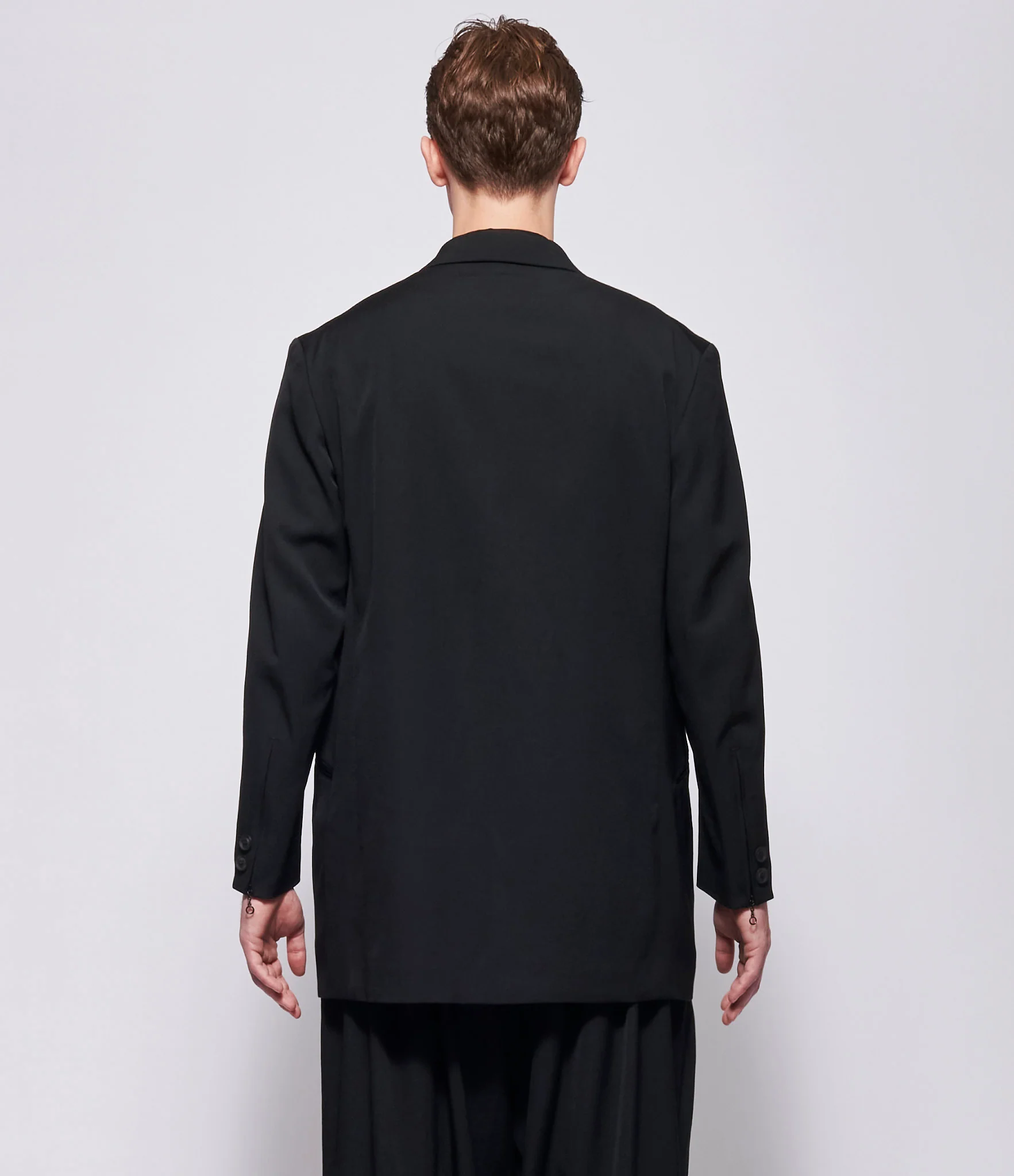 Wool blazer in black. Relaxed straight silhouette with hem extending to mid thigh. Notch lapel collar. Single breasted front with two button closure. Structured shoulders. Long sleeves. Buttoned sleeve vents with two button detail at cuffs. Welt chest pocket at left chest. Angled welt pockets at front hips. Center back seam with rear vent at hem. Right interior pocket. Lined.