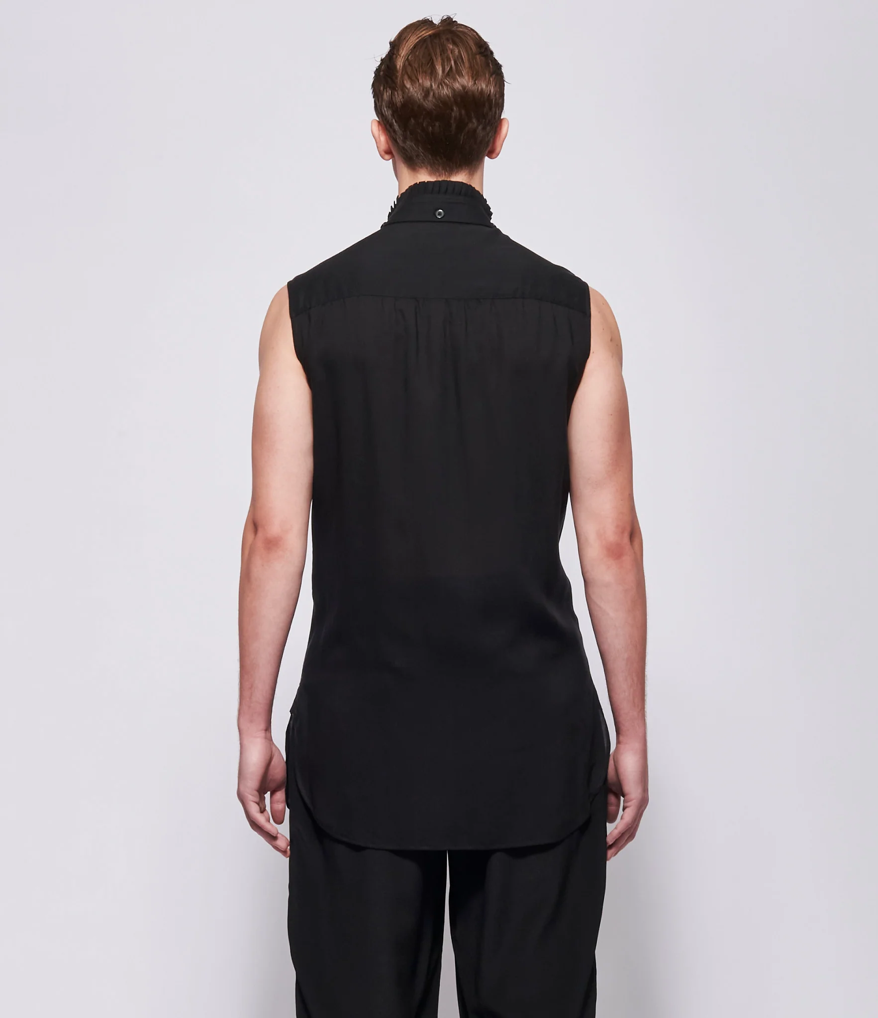 Cellulose sleeveless shirt in black. Stand collar with removable ruffled trim and removable neck tie detail allowing wear with or without. Concealed full button front closure when collar is worn. Sleeveless construction with clean arm openings. Single welt chest pocket at left chest with button detail. Curved hem with extended length. Light gathering at upper back yoke. 100% cellulose. Dry clean only. One Size. JP sizing. Model is wearing size 2.