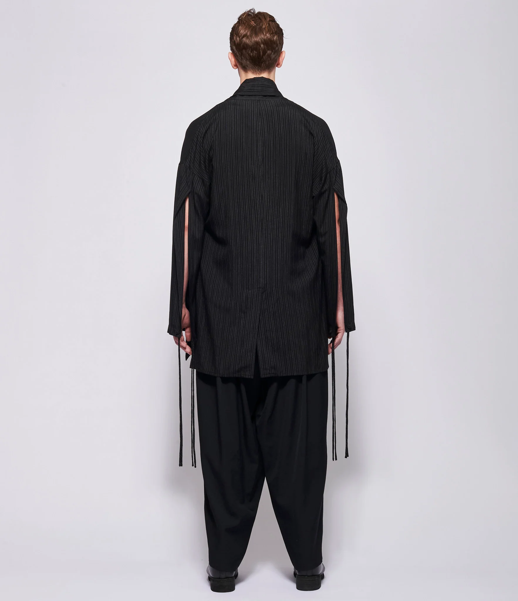 Rayon vertical pinstripe jacket in black/gray. Relaxed loose silhouette. Straight hem falling to upper thigh. Shawl collar with soft draped lapel. Dropped shoulders. Long sleeves with open slit construction along underside from upper arm to cuff. Open front with single cord tie closure at mid-front. Center back seam with short vent at hem. Unlined. 100% rayon. Dry clean only. One Size. JP sizing. Made in Japan. Model wearing size 2.