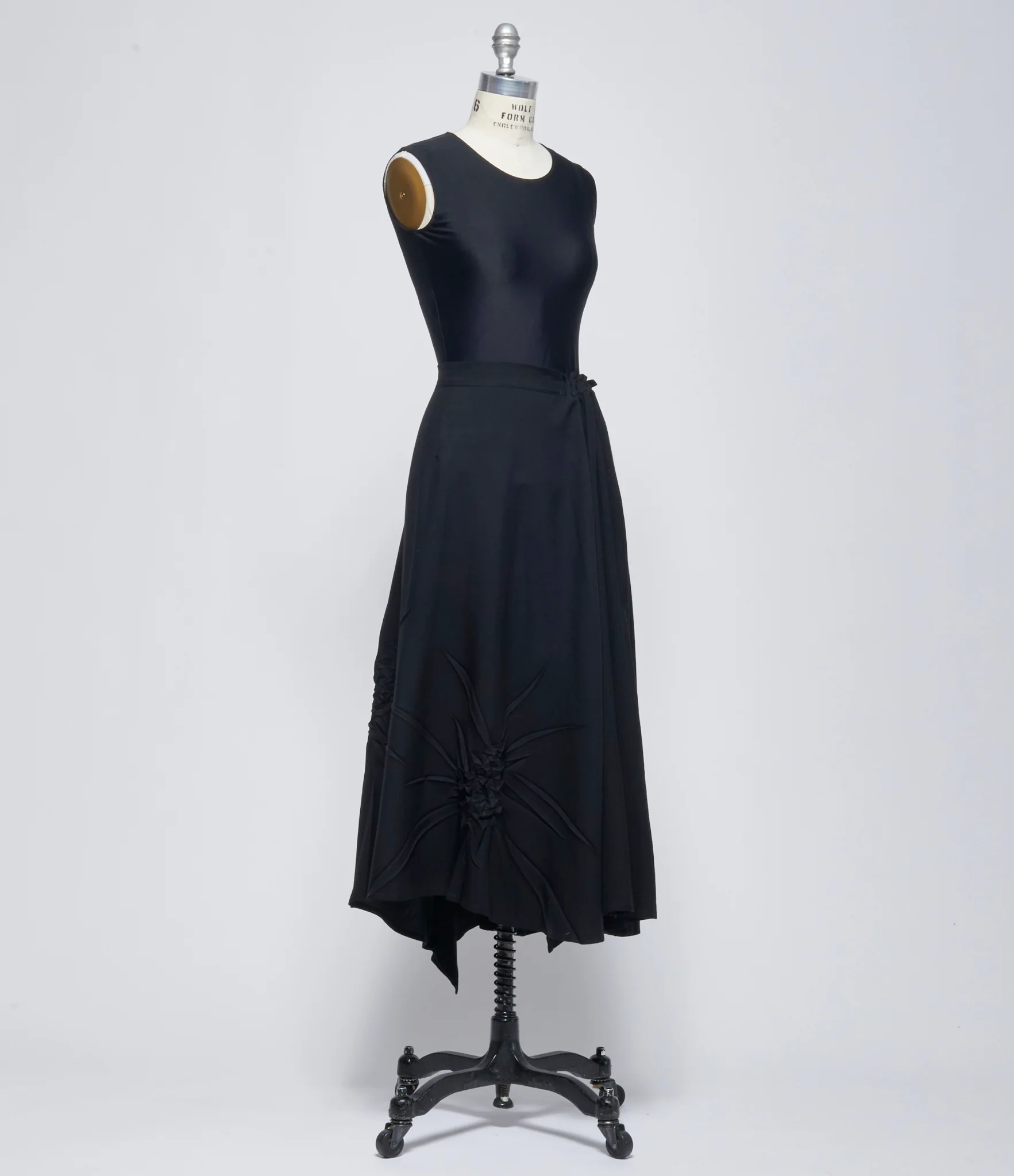 Rayon cotton blend skirt in black. Midi length with asymmetric hemline. Softly flared A-line silhouette. Draped wrap-style panel construction gathered at waist creating directional volume. Crinkled treated detail throughout. Side drawstring closure. Single external inseam pocket. 51% rayonne, 49% cotton. Dry clean only. JP sizing. Made in Japan. Mannequin is wearing size 1. Mannequin size 6.