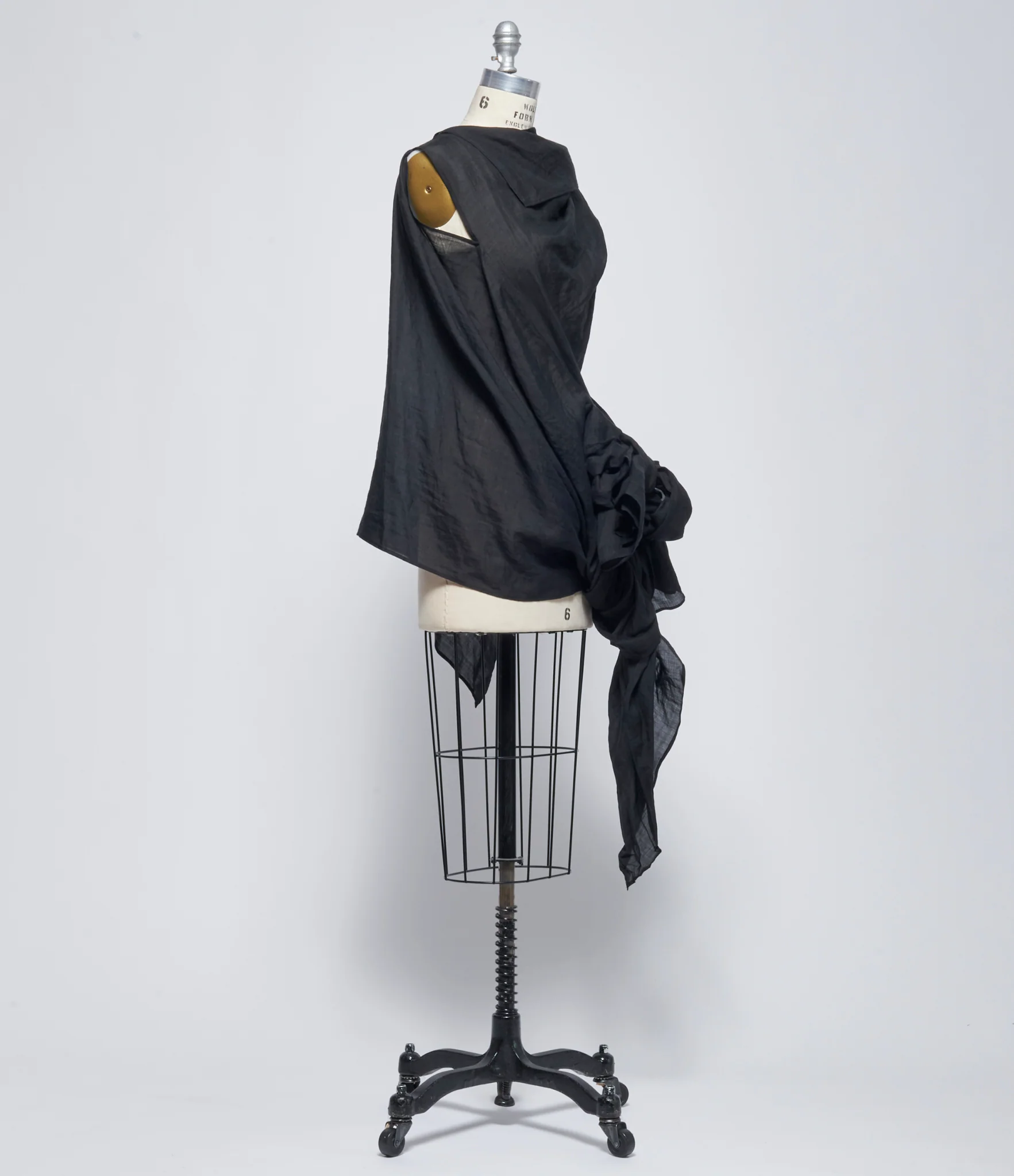 Ramie top in black. Asymmetric draped silhouette with relaxed fit. Hip length with uneven hem. Wide folded boat neckline extending into off-shoulder draped construction. Integrated self-tie fastening at waist forming gathered knot detail. Lightweight gauze texture with soft crinkled finish. 100% ramie. Dry clean only. JP sizing. Made in Japan. Mannequin is wearing size 2. Mannequin size 6.
