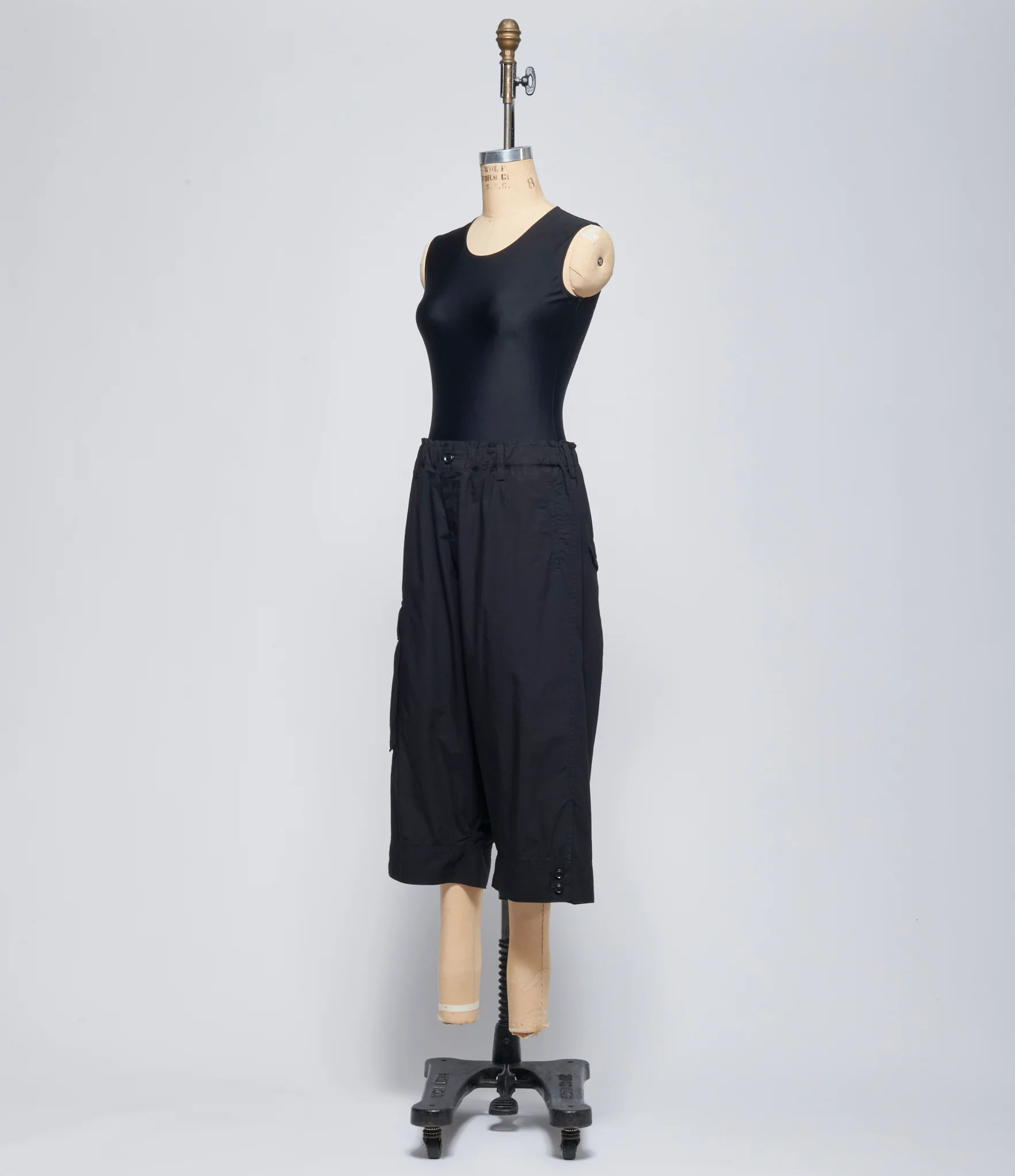Cotton trousers in black. Voluminous wide-leg silhouette with dropped crotch and cropped below-knee length. Mid-rise elasticated waistband with additional front button tab closure. Partial fly front with button fastening. Slanted side seam pockets. Large flap patch cargo pocket at side leg. Back flap patch pockets with button closure. Adjustable hem tabs with button fastening at cuffs. 100% cotton. Dry clean only. JP sizing. Made in Japan. Mannequin is wearing size 1. Mannequin size 6.